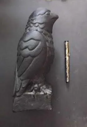 A year later, on one of my habitual pilgrimages to Venice Beach’s colorful shops, another bird landed in my collection; this time it was The Maltese Falcon. It has none of the grace of the Horus falcons; in fact it’s kind of klunky. The classic noir movie deserves a better leading bird for such a superb cast and script. But this was what Warner Bros. prop department came up with and it flew. Now I had my own replica of the bird to sit in my living room looking broodingly at the two sleekly designed Egyptian birds flanking a marble-topped bar.